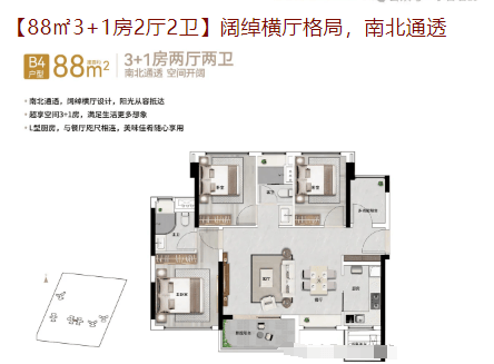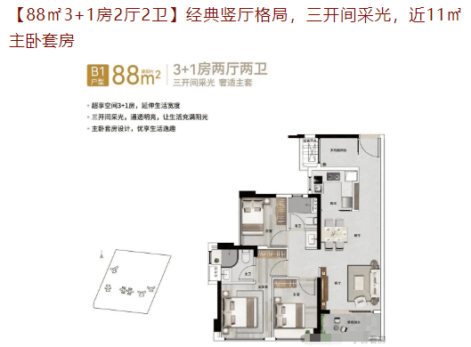 88㎡3+1房:经典竖厅格局,南北通透,总价约385万起。