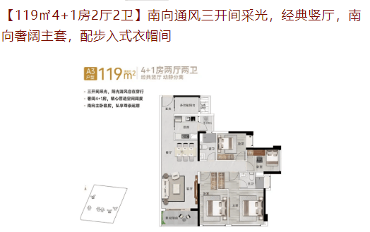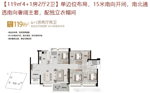 119㎡4+1房:单边位布局,15米南向开间,南北通透,适合改善型家庭。