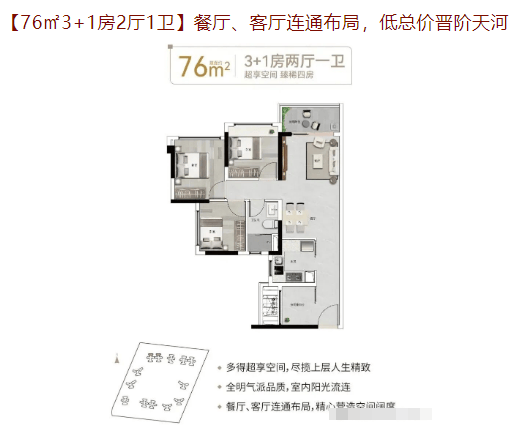 76㎡3+1房:总价约320万起,适合刚需家庭。