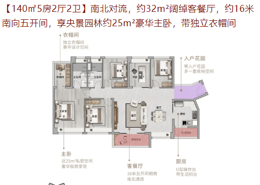 140㎡5房:南北对流,享央景园林,适合追求高品质生活的家庭。