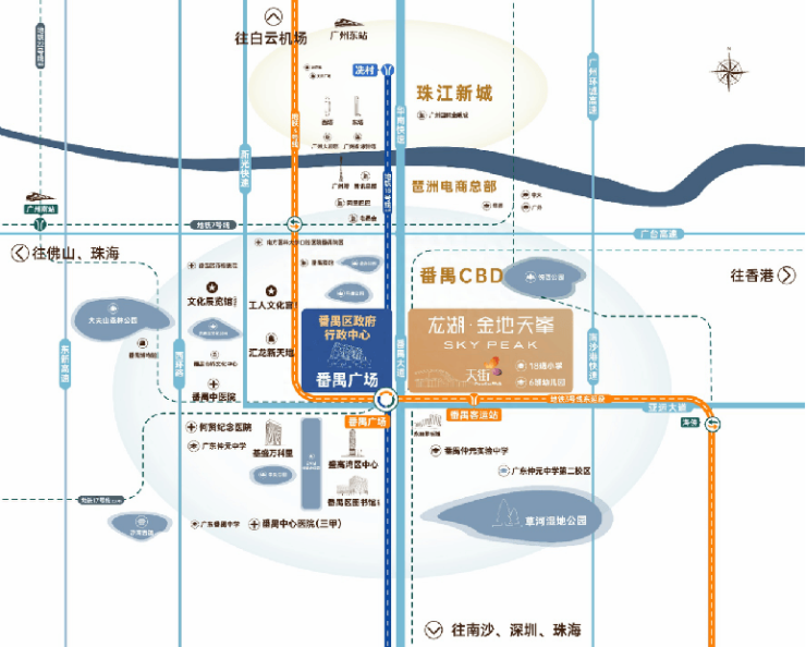 龙湖金地天峯落子广州城市中轴线上的番禺行政中心板块,占据区域发展制高点。项目为地铁3号线东延段番禺客运站上盖物业,步行即达,一站直达番禺广场枢纽,并可快速换乘18号线、22号线等,形成五轨交汇格局,30分钟内畅达万博CBD、琶洲数字经济试验区及珠江新城核心区。地面交通同样发达,“三横五纵”路网环绕,自驾出行便捷无忧,真正实现“轨道+城市主干道”双维高效通勤。