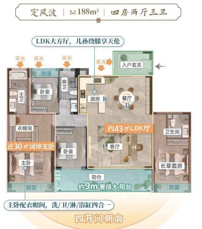四开间朝南的设计,确保了充足的采光,让室内始终保持明亮温暖。7 米长的景观阳台,宛如一个空中花园,不仅延伸了生活空间,还能让人在享受园林美景的同时,放置绿植、休闲桌椅等,容纳生活的琐碎,成为家庭休闲娱乐的好去处。