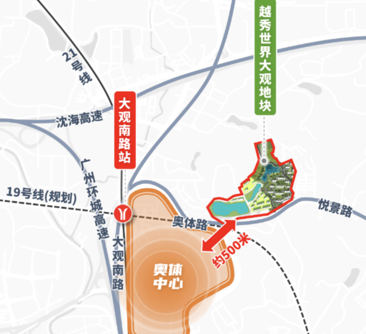 项目位于天河区世界大观板块,东接珠吉路,西连奥体路,毗邻帝景山庄及天河湖区核心景观资源。现有交通条件包括悦景路主干道及奥体快速通道,公共交通主要依赖大观南路地铁站,约2公里距离,未来交通将因悦景路拓宽及新建道路而大幅改善。
