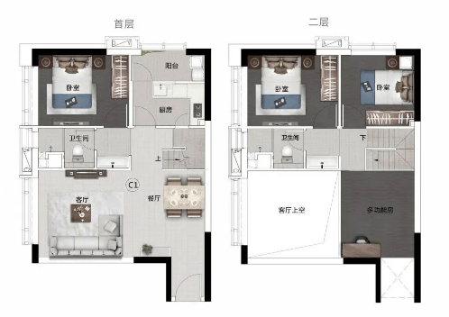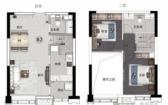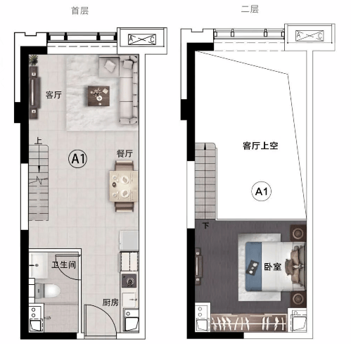 约 49.72㎡灵动 LOFT:约 4.5 米层高,挑空客厅,餐厨客一体,整层主卧,上下灵动分区。