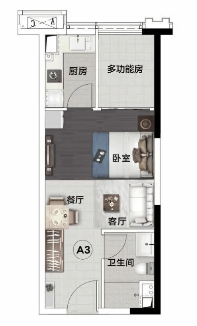 约 46.22㎡轻奢平层:两房两厅方正户型,明窗采光,餐厨独立,多功能房灵活拓展。