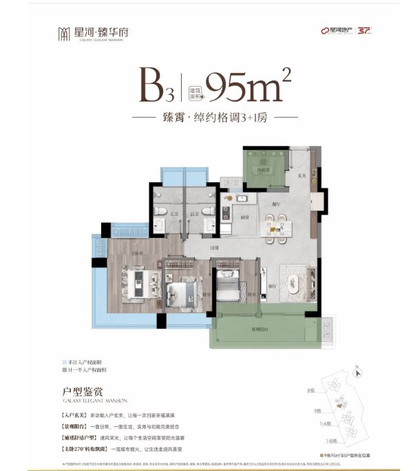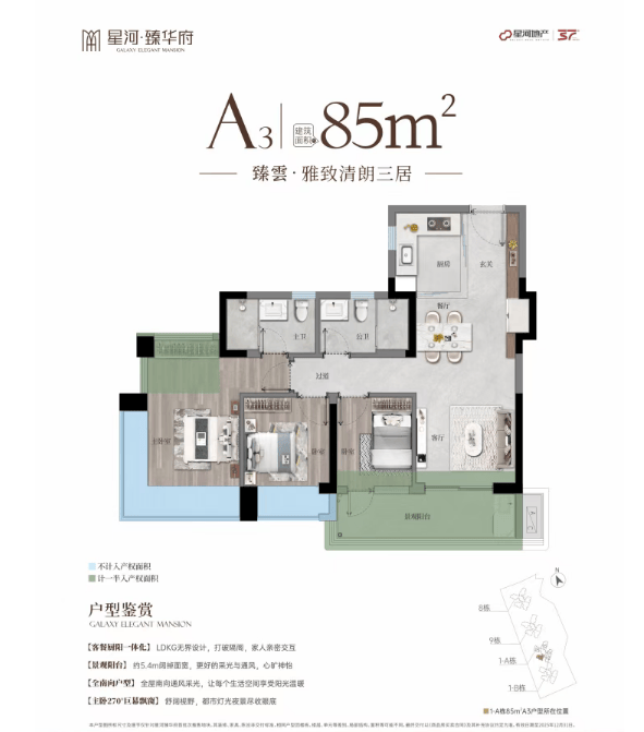 【星河臻华府】的户型设计堪称一大亮点,项目采用新规产品,使用率接近100%,实现了真正的“零浪费”。主力户型涵盖85-128㎡的三至四房,所有户型均为全南向设计,最大限度地引入自然光与通风。例如,85㎡的三居室户型采用了LDKG创变宽厅设计,配备270°无边观景主卧,95㎡的三居室户型则提供了入户飘窗玄关和主卧270°飘窗观景,107㎡的四居室户型更是实现了4开间朝南,270°全景主卧飘窗。128㎡的四居室户型则进一步提升了空间的灵活性与功能性,设置了迎宾入户花园和宽幕景观阳台。通过精细化的空间布局与人性化设计,【星河臻华府】重新定义了科学城乃至整个广州的高端人居新标准。