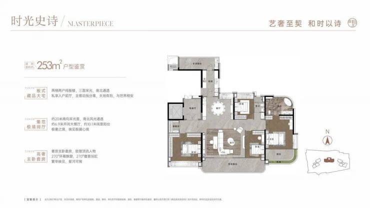 253平方米户型(楼王): 位于2栋,两梯两户专梯专户设计,层高达到3.3米。四房两厅两卫,竖厅设计,南北对流。阳台长达10米,主卧飘窗和主卫均为270度弧形采光面,视野无遮挡。这是真正的终极改善产品,适合追求极致生活品质的高端人群。