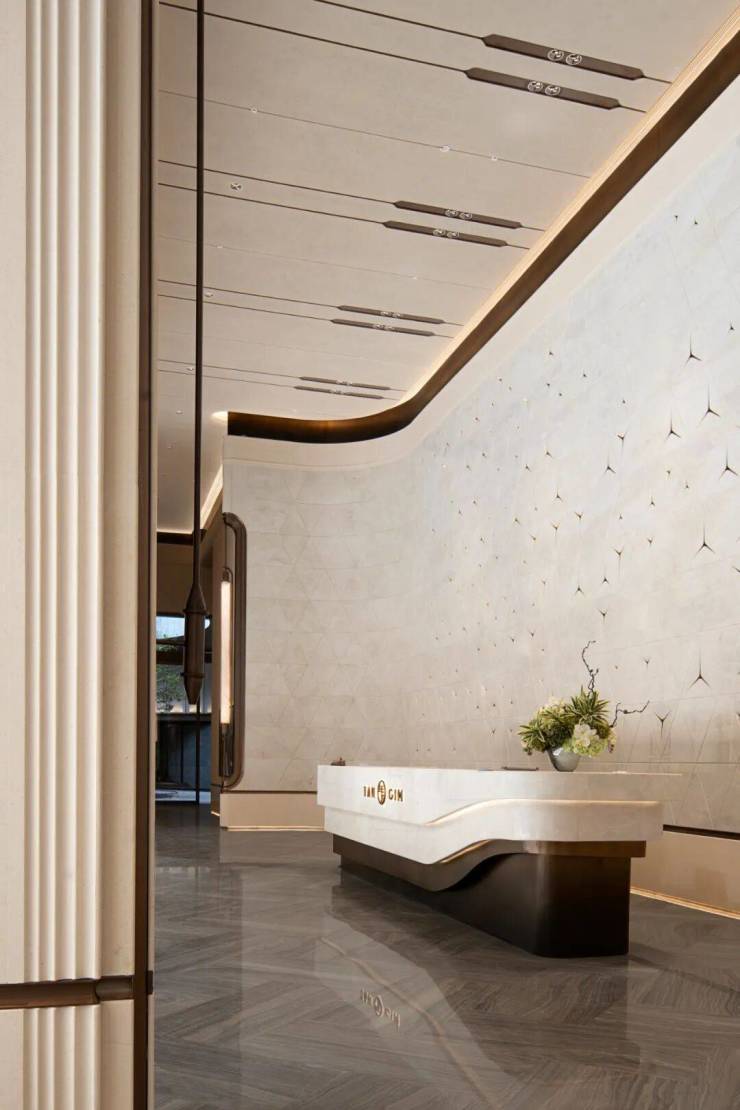 归家仪式感: 项目第一步便是营造比肩超五星级酒店的归家体验。主入口种植了高约3米的罗汉松,与冬青树共同构成第一重归家仪式。天然石材铺就的地面延伸至恢弘的下沉式落客区,背景墙采用一整面Prada绿大理石构建,参考罗马万神庙设计,气势磅礴。进入大堂,约8米挑高的空间内,整面墙由色白通透的皇家白玉奢石铺就,配合内部隐藏灯带,形成“星辉漫墙”的震撼效果。