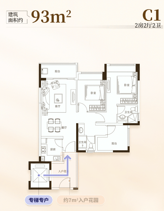 93㎡竖厅三房:刚需入门首选,罕见专梯专户配置,带约 7㎡入户花园,主采光面约 9.8 米,动静分区明确,主卧套间设计(卫生间门侧置,保障隐私),适合年轻三口之家;