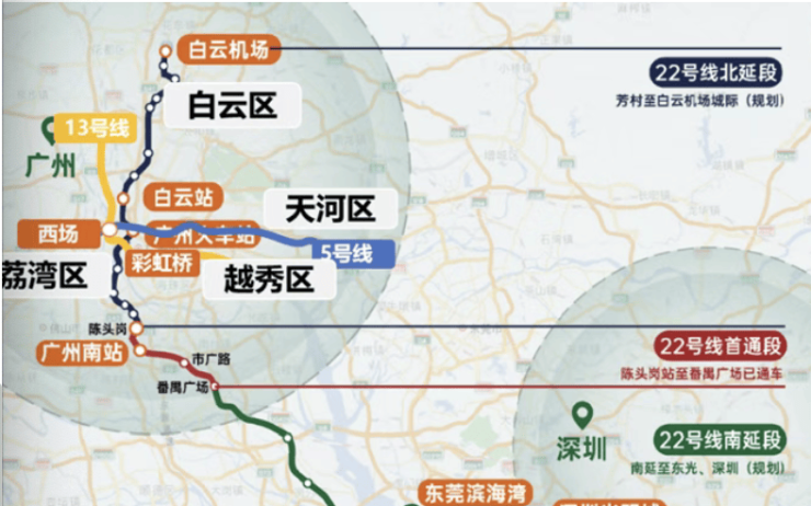 越秀星瀚 TOD 为 22 号线陈头岗站地铁上盖项目,A2/B2 出口与社区通道直接相连,归家出行风雨无阻,高德地图实测地铁口距社区入口仅 50 米,是真正的地铁口物业。22 号线为广州高速地铁,3 站直达海珠、5 站抵达珠江新城,换乘 18 号线快线可快速通达冼村、万博等核心板块;22 号线北延段预计 2026 年底通车,8 站直达白鹅潭,可换乘 1、2、5、8 等多条地铁线,贯穿海珠、荔湾、越秀、天河四大主城区,通达全城无压力。