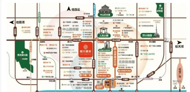 城市的核心地段,永远是房产价值的核心支撑。广州历经多年发展,城市中轴不断延伸,但越秀区作为城市原点,始终占据着不可替代的核心地位。公园前・明月豪庭雄踞广州市中心核心中轴,地处越秀区解放中路,精准坐落于北京路商圈、中山六商圈、海珠广场批发商圈三大核心商圈交汇处,三大商圈人流、物流、资金流高度汇聚,形成了独一无二的商业价值闭环,让项目从诞生之初就站在了广州楼市的价值顶端。