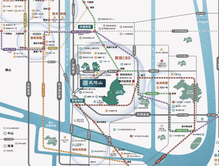 根据广州市住建局及阳光家缘网数据,黄阁板块近4年均为南沙成交TOP1区域,居住氛围浓厚,配套成熟。项目周边“三纵三横”路网(广澳高速、南沙港快速、东部快速干线),15分钟直达南沙区政府,30分钟通达天河CBD,地铁4号线黄阁站(直线距离800米)2站直达庆盛枢纽,无缝接驳广深港高铁,30分钟至深圳、1小时达香港,真正实现“湾区1小时生活圈”。