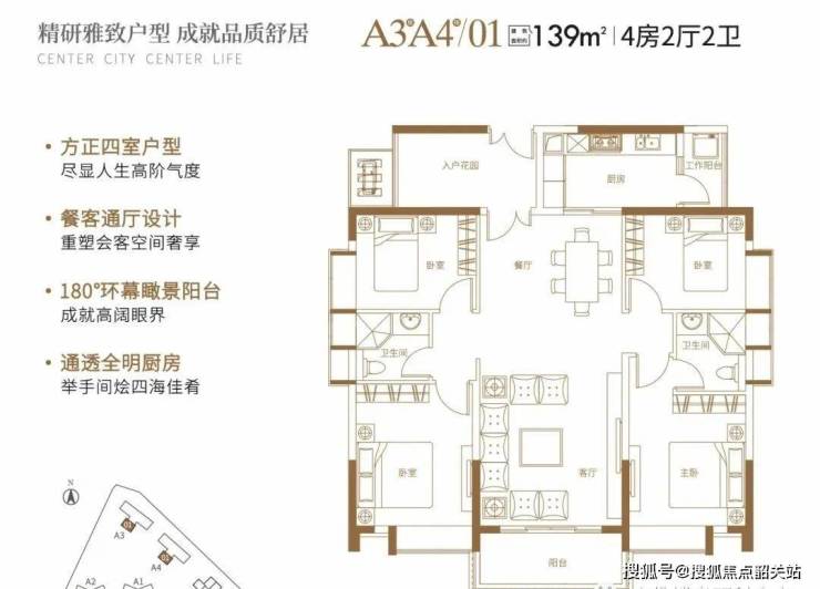 143㎡奢阔四房:双主卧设计,独立衣帽间,7米超宽景观阳台,尽享270°园林视野。