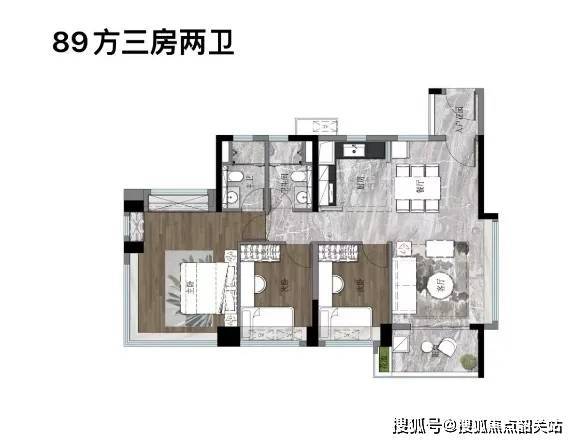 89-92㎡三房两卫:总价350万起,4开间朝南,主卧套房设计,功能性完胜二手次新房。