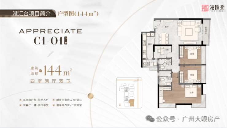144㎡四房两厅二卫,东南向户型,阳光入户,瞰景主套房,270度望江,餐客厅一体,阔尺享受,奢享级四房,三代同堂