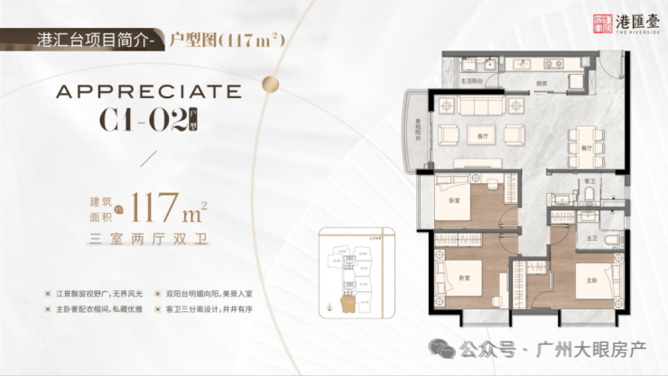 117㎡三房两厅两卫,阳台飘台视野广,无界风光,主卧奢配衣帽间,私藏优雅双阳台向阳,美景釆光入室,客卫三分离设计,井井有序