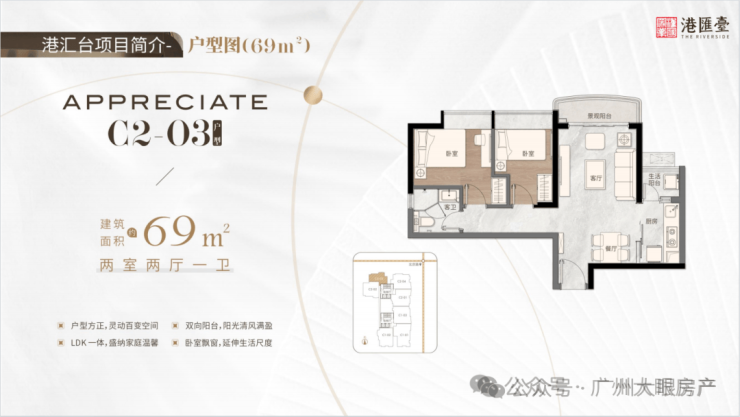 69㎡双阳台两房两厅一卫,户型方正,灵动百变空间,LDK一体,盛纳家庭温馨,双向阳台,阳光清风,视野开阔,全飘窗设计,增加室内利用空间