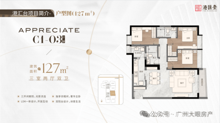 127㎡三房两厅两卫,三开间朝阳,釆光景观无遮挡,LDK一体设计,开放互动,大开间设计,释放更大的活动空调,双阳台设计,诗意生活