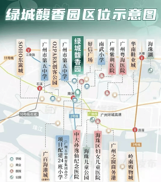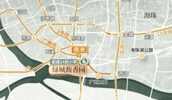绿城馥香园坐落在海珠湾心,遥望广州塔、海心沙等知名地标,拥有优越的地理优势。项目背靠河涌,周边环绕着丰富的自然景观资源,包括海珠儿童公园、海珠湖以及海珠国家湿地等,形成了一道天然的生态屏障。
