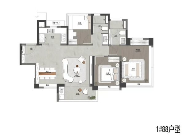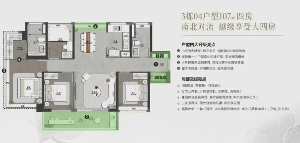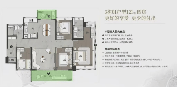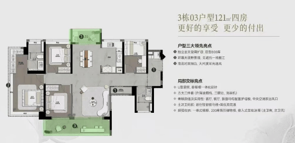 项目使用率超125%,部分户型的实际使用率更高。具体户型方面,建面88平至127平不等,涵盖了三房两卫至四房两卫等多种选择。所有户型均采用了LDKB一体化设计理念,增强了空间的开放性和互动性,同时每个卧室都保证了足够的宽敞度,主卧更配备了独立衣帽间和270°环幕飘窗,彰显奢华与尊贵。