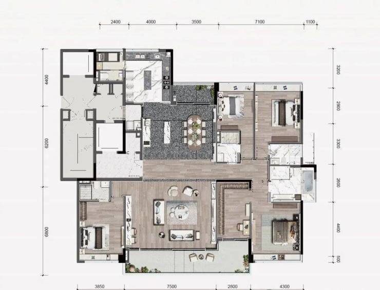 290㎡五房两厅四卫(楼王产品):空间尺度极为从容,约80平方米客餐厅+45平方米主卧套房,超9成使用率,约赠送30平方米。3.5米层高、三梯两户设计,私密性强,居住仪式感突出。