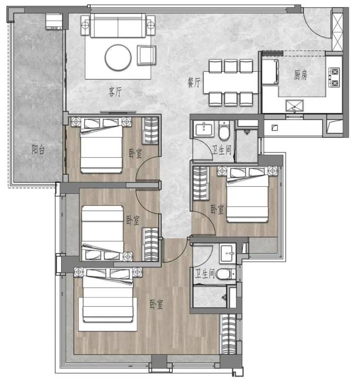 建面约85㎡三房两卫:该户型带有两个卫生间,更适合家庭成员较多的情况。三个房间带有大飘窗,增加空间使用灵活性与采光面,是改善型家庭的理想选择。