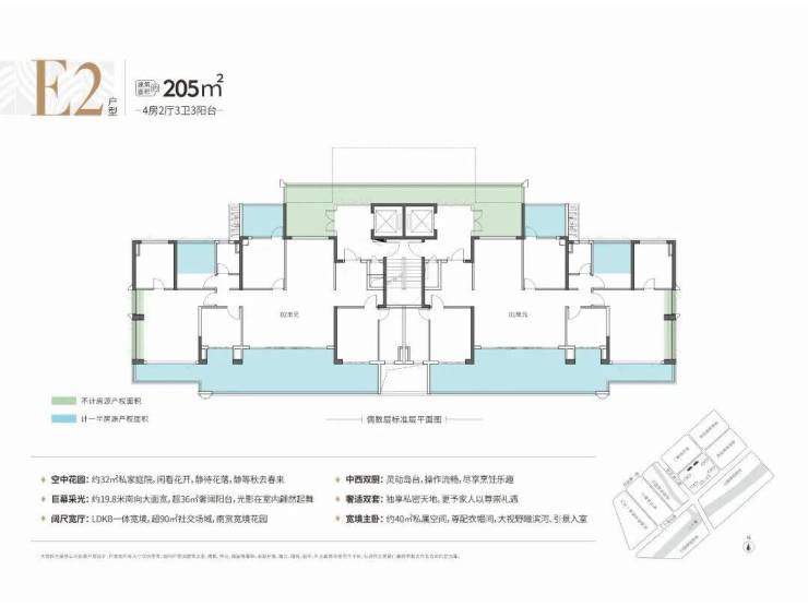 项目主打建面约132–205㎡的纯大户型四代住宅,使用率高达约130%,远超市场平均水平。以205㎡的E2户型为例,不仅拥有约36㎡的南向阔景阳台,还配备约32㎡的专属空中庭院,真正实现“大平层+庭院生活”的融合。LDKB一体化宽厅面积超90㎡,南向采光面达19.8米,主卧面积超35㎡,尺度堪比顶级豪宅。所有户型均采用专梯专户设计,保障隐私;约3.15米层高配合270°环幕观景体系,让海风、湿地、红树林尽收眼底。部分户型更设有6米挑高露台,可灵活改造为茶室、亲子乐园或星空书房。这种将生态资源转化为生活场景的设计思维,正是其区别于深圳、珠海同类海景盘的关键所在。