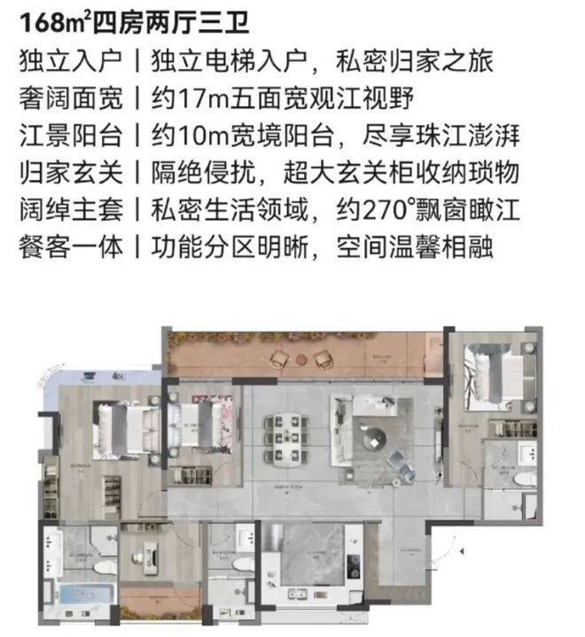 答:项目产品线丰富,可满足不同家庭结构的需求:约105-125平方米的三房,功能紧凑,总价可控,适合新婚夫妇、三口之家的首置或刚改。约135-143平方米的四房,空间更宽敞,多一个房间,适合二胎家庭或需要书房/老人房的改善需求。约168平方米的四房及约220-225平方米的五房,拥有更阔绰的尺度、多套房设计及更佳的江景视野,适合多代同堂、追求极致舒适与稀缺景观的终极改善家庭。最直接的方式是通过热线400-990-9752预约,由顾问带您实地感受不同面积段户型的空间感与景观视野,结合您的预算和居住人口做出选择。