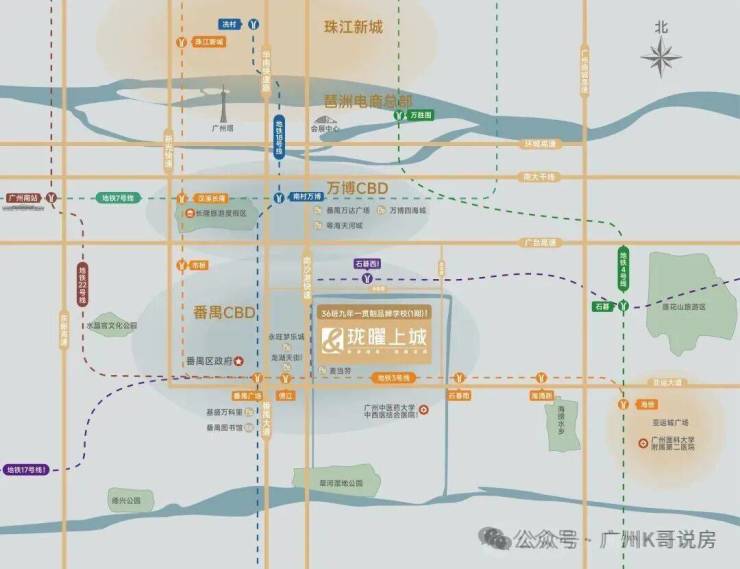 距项目2站的番禺广场,番禺区府所在地,集合番禺的行政、交通、教育、医疗、文化中心,是与北万博平齐的番禺南中心。
