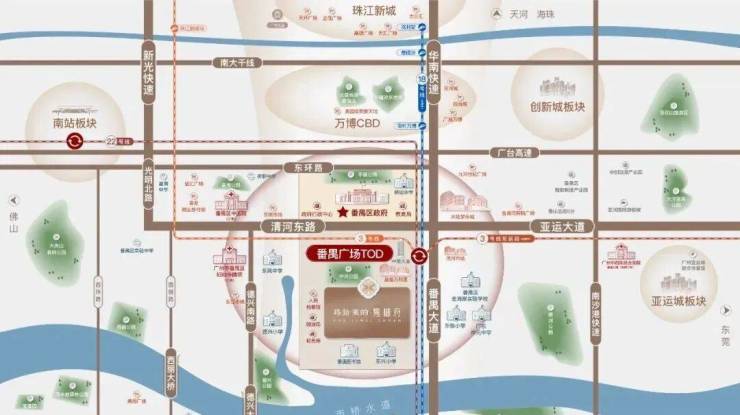 广州惟一双高速地铁区域。项目距离地铁番禺广场站约 900 米距离,囊括3号线、3号线东延段(在建中),已开通的广州地铁 3 号线、18 号线、22 号线,未来规划有广州地铁 17 号线,5 轨汇聚于此,如此便捷的交通路网是其他板块难以比拟。