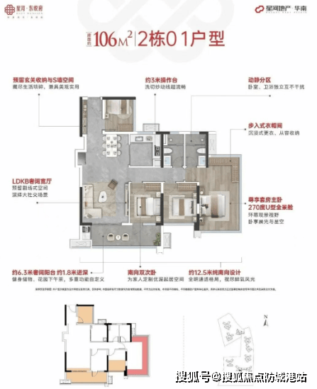 106㎡四房:配备约6.7米大阳台,南北对流设计,空间利用率极高。