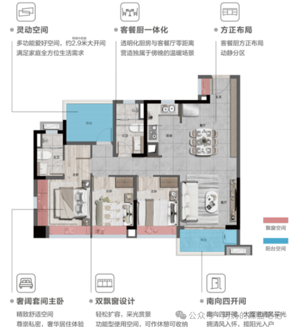 灵动空间:南北通透双阳台设计,餐客厅与阳台相连,空间灵活多变,可根据实际需求改造。