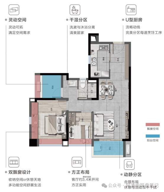 实用率高:户型设计科学合理,通过优化空间设计,如LDKB一体化、U型厨房、干湿分离卫生间等,实现了85-87%的高实用率。同样面积可多出近10㎡使用空间,彻底颠覆传统住宅的空间利用逻辑。