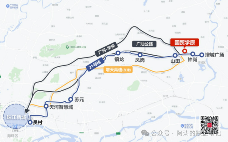 项目距离地铁21号线山田站和钟岗站较近,快线5站直达天河,3站到达科学城。