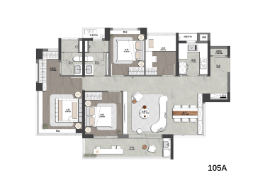答:建面约 105㎡户型打造四开间朝南格局,南向面宽约 12.8 米,实现超强通风与全明采光。
