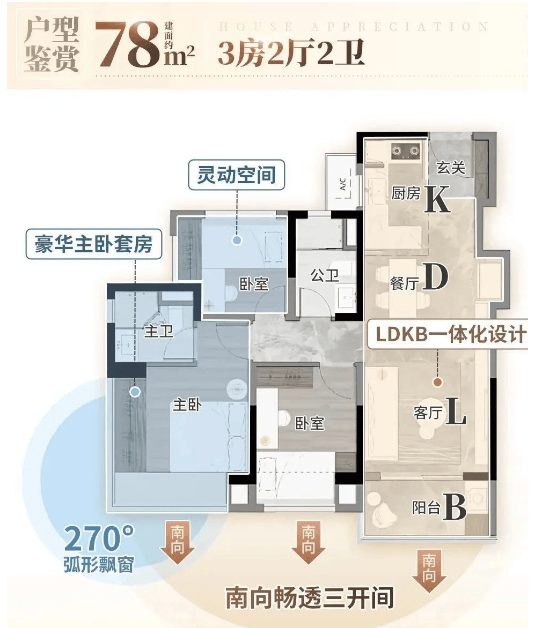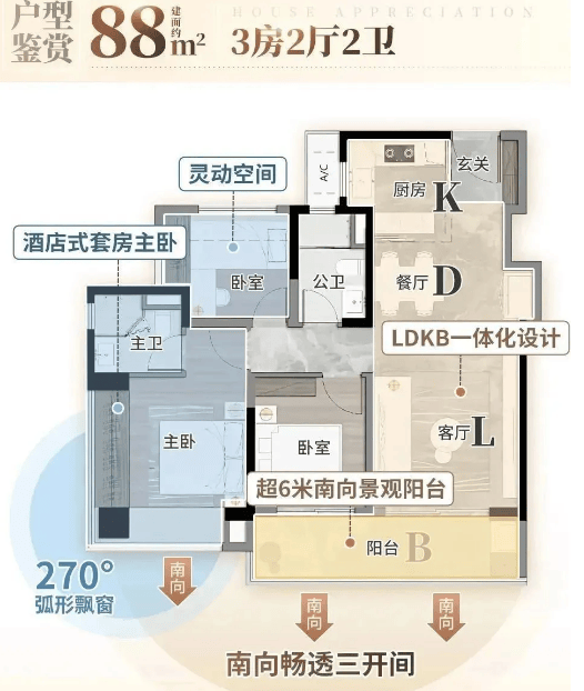 布局:该户型同样为全南向设计,整体布局舒展,空间利用率高,动静分区清晰,公共区域与私密区域互不干扰。客厅开间约3.8米,与餐厅、阳台相连,打造开阔的通透空间,采光通风效果极佳,客厅阳台为南向景观阳台,长度约4.2米,可用于晾晒、休闲,同时能欣赏龙头山森林公园或社区园林景观;主卧朝南,配备独立卫生间和大飘窗,空间宽敞舒适,私密性强,飘窗可改造为休闲区、储物区,增加使用空间;两个次卧朝南,其中一个次卧带有飘窗,另一个次卧可灵活改造为书房、儿童房,满足不同家庭需求;公共卫生间干湿分离,位于两个次卧之间,使用便捷;厨房为L型设计,操作空间充足,通风效果好,避免油烟堆积,同时靠近餐厅,方便上菜;此外,户型还配备独立玄关,增加储物空间,同时提升入户仪式感。