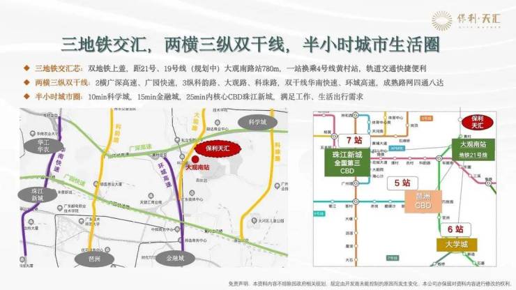 地铁交通方面,项目距离地铁21号线大观南路站约1.2公里,步行约15分钟即可到达;另有信息显示,首开地块距离该地铁站约780米,步行约10分钟可达,具体距离因楼栋位置有所差异。地铁21号线贯穿天河、黄埔、增城等区域,一站换乘4号线可去往金融城、琶洲等核心商圈,4站到员村换乘5号线直抵珠江新城,能够快速通达天河区各个核心区域,满足业主通勤、购物等出行需求。此外,规划中的19号线也将穿越该区域,未来地铁交通将更加便捷,进一步提升项目的交通优势。