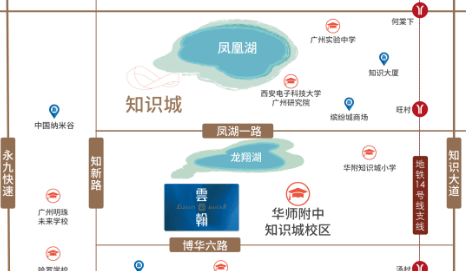 广开云翰一路之隔便是华附知识城校区,直线距离仅100米,该校为黄埔区截至目前投资规模最大、技术标准最高的学校,已于2023年正式招生。初中部采取自主招生+全区摇号的方式,业主子女有机会入读这所优质学校。周边还有华附知识城小学、广东外语外贸大学知识城实验小学、凤凰湖小学、广州实验中学&小学、新侨中学等多所学校,教育资源十分丰富。