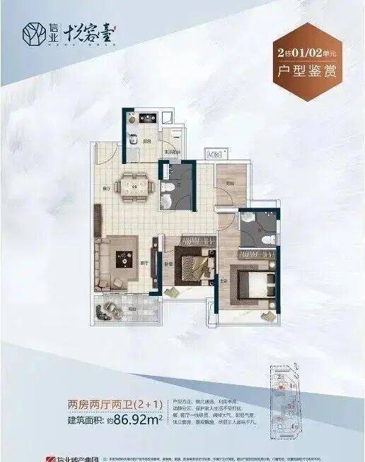 86.92㎡两房(2+1)两厅两卫:南向设计,阳光充足,灵动的“+1”空间可根据家庭需求灵活改造。