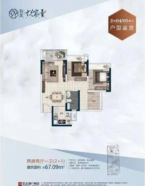 67.09㎡两房(2+1)两厅一卫:北向户型,面积虽小但功能齐全,“+1”空间增加了实用性,适合刚需购房者。
