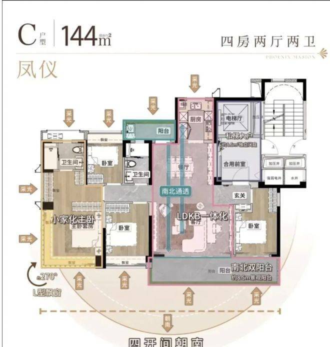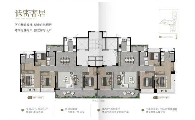 户型设计很有亮点。主力户型 108㎡、128㎡、144㎡,全是四房。108㎡做到 3 + 1 房两厅两卫,南向四开间,约 6.3 米双面宽阳台,使用率约 100% 。128㎡四房两厅两卫,南向四开间,约 7.5 米双面宽阳台,同样约 100% 使用率。144㎡四房两厅两卫,私梯入户,还有约 8.5㎡独立门庭,约 8.5m 南向景观阳台加北向生活阳台,南向四开间,实用率也约 100%。得房率这么高,在市场上可不多见,性价比超高。
