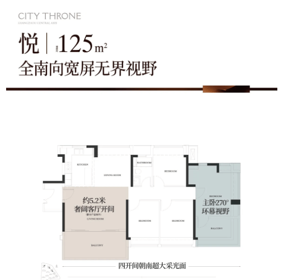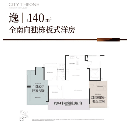 该140平户型采用四开间朝南设计,配备270°飘窗、约8.4米南向巨幕阳台及双南向套房,空间利用率极高。约34㎡LDKG宽厅可容纳8人座大餐桌,满足亲友聚会需求;双南向套房设计,适合与父母同住,兼顾隐私与舒适性;巨幕阳台与270°飘窗最大化引景入室,让业主在室内即可享受白云山与社区园林的双重景观。