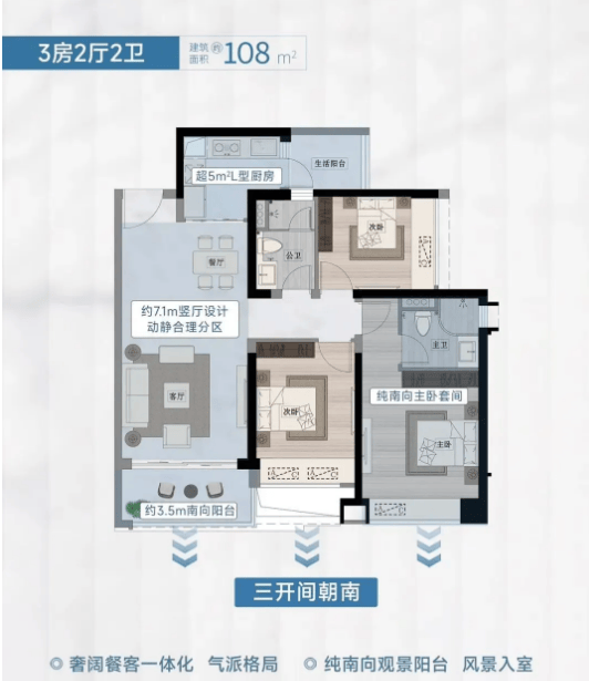 品质三房|建面约108㎡三房两卫:该户型采用奢阔餐客双厅设计,空间通透开阔,采光通风效果极佳;纯南向双阳台布局,一方面保证了室内充足的采光,另一方面可打造观景、晾晒双重功能空间,实用性强;L型厨房设计符合人体工学原理,操作流程顺畅,提升烹饪效率;豪华主卧套间配备独立卫生间与衣帽间,保障主人的居住私密性与尊贵感,适合三口之家居住。