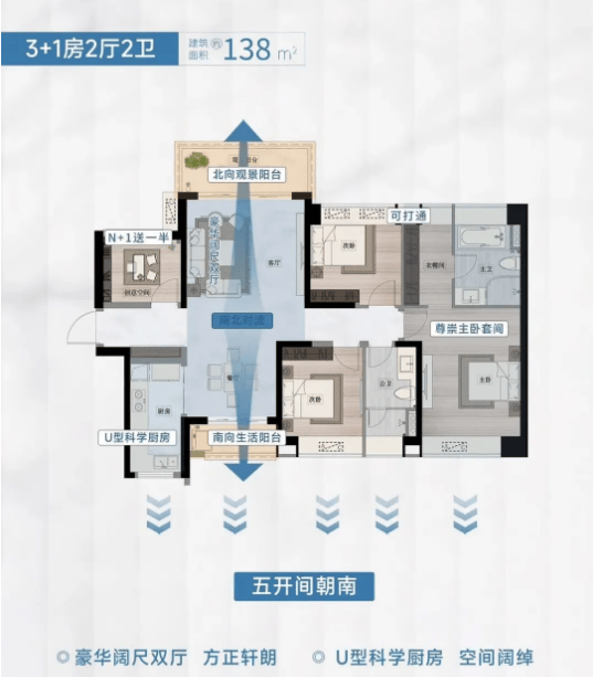 南北对流大平层|建面约138㎡四房两卫:该户型最大亮点为南北双阳台设计,实现真正的南北对流,室内空气循环通畅,居住舒适度极高;5开间朝南,保证室内各个空间都能获得充足的采光,让家充满阳光;高赠送面积提升空间利用率,可根据家庭需求灵活改造;超大主套设计,配备独立卫浴与步入式衣帽间,满足品质生活需求;百变空间可打造为书房、儿童游乐室等,适配多孩家庭或三代同堂的居住需求;大厨房空间宽敞,可容纳多人同时操作,适合热爱烹饪的家庭。