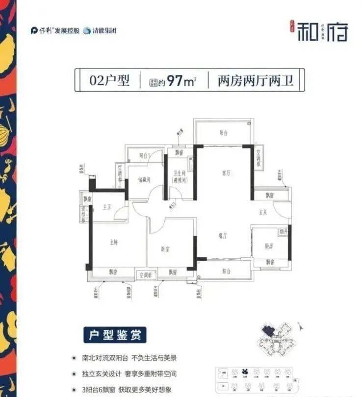 约97㎡三阳台五飘窗:南北对流双阳台,通风采光俱佳,市场稀缺;