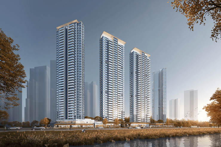 项目建筑外立面采用铝板+LOW-E曲面玻璃组合,不仅具备优良的隔音、隔热、防紫外线效果,有效提升居住舒适度,还兼具极高的美观性,线条简洁流畅、造型大气挺拔,彰显高端奢宅的质感与格调,在阳光下呈现出通透灵动的视觉效果,与周边的江景、公园、城市景观完美融合,形成独特的城市天际线。