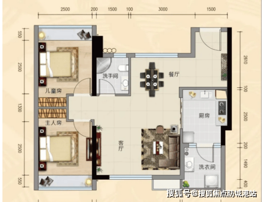 9㎡两房两厅一卫:该户型格局方正,南北通透,采光通风效果俱佳。采用客厅-餐厅-厨房一体设计,布局合理,动静分区明确,提升了空间利用率。主卧自带大飘窗,推窗即可奢享珠江一线江景,让小户型也能拥有优质景观视野。