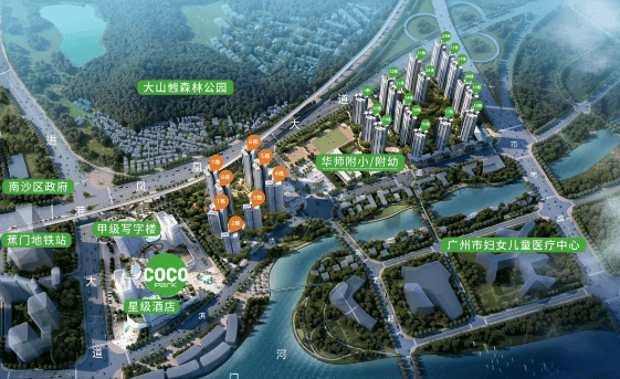 小区自带 10 万㎡情景式购物中心 COCO Park,集潮流、美食、运动、休闲、娱乐于一体。还引进了精品超市百佳永辉、横店影城等众多知名品牌。现代全龄园林盛境,规划了儿童活动、运动、老年休闲等区域。周边还有南沙区第二人民医院、广州市第一人民医院南沙医院等优质医疗资源。