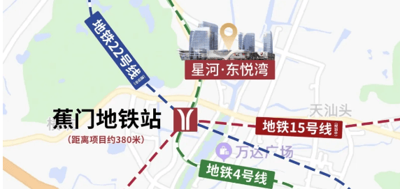 星河东悦湾位于广州南沙区府旁、蕉门地铁站附近。周边交通极为便利,地铁 4 号线已运营,3 站可到庆盛高铁站,可转乘达深圳、香港。此外,规划中的地铁 15 号线和建设中的 22 号线也将在此交汇。驾车出行,通过凤凰大道和进港大道可快速抵达各处。周边还有南沙万达广场、奥园中环广场等大型商业中心,以及广州市妇女儿童医疗中心等医疗资源。