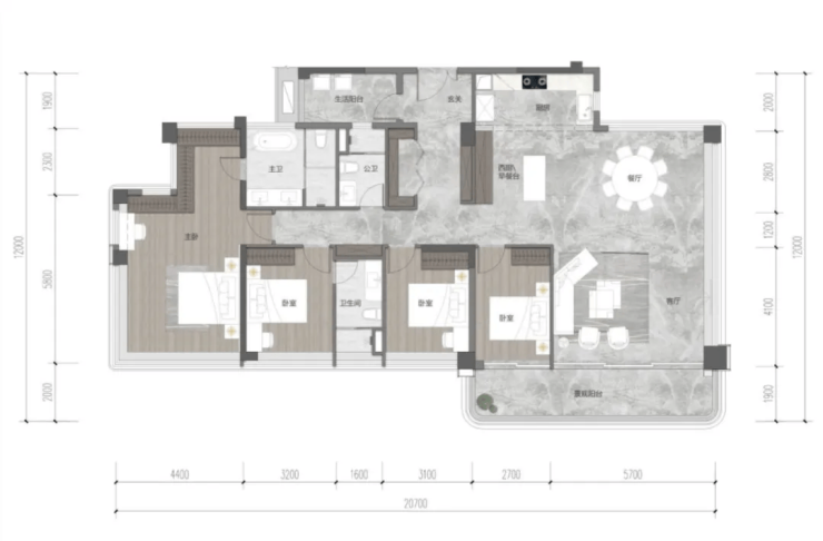 116㎡户型延续了高使用率的优势,双阳台配置是一大亮点,兼顾了功能实用性与居住舒适度。一个阳台可以用来晾晒衣物、放置杂物,保持室内整洁;另一个阳台可以打造成为休闲区,摆上桌椅,喝茶看书,欣赏窗外风景。该户型能很好地满足多人口家庭的居住需求,二胎家庭也能拥有宽敞的居住空间,每一位家庭成员都能有自己的私密领域。